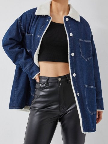 Description: Upgraded this warm & versatile denim jacket to your new wardrobe. Made from dark wash denim fabric, it has faux fur lining, features a longline fit, contrast stitched detail through the bodice, with functional pockets patched at front, dropped shoulders and button fasten design.
