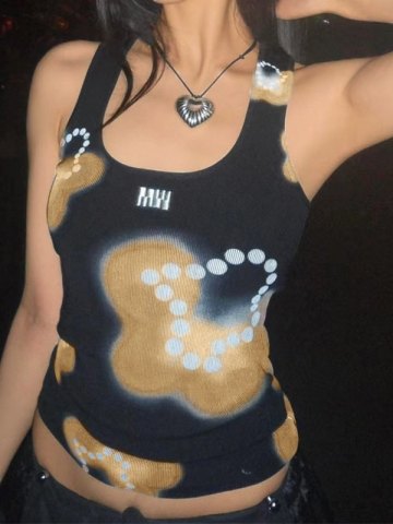 Floral Printed Letter Embroidery Slim Fit Tank Top