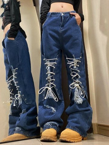 Description: Ripped jeans are cool and stylish for chic street outfits. These jeans shaped to a flattering straight-leg silhouette, it has front paneled with criss-cross tie strap detail, features frayed rips design to the leg, and fastened a metal button zip fly.