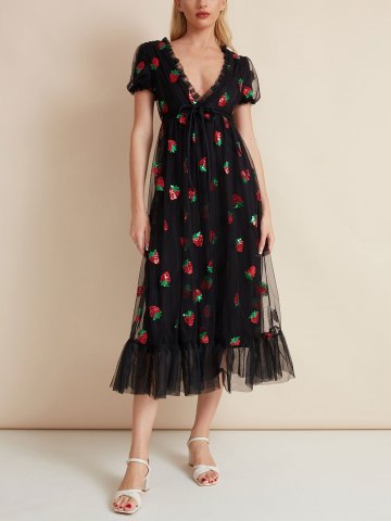• EMMIOL Sequined Strawberry Mesh Pleated Maxi Dress