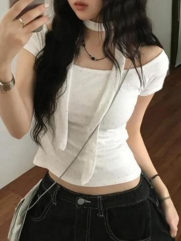 • EMMIOL Silver-Embossed Polka-Dot Short Sleeves