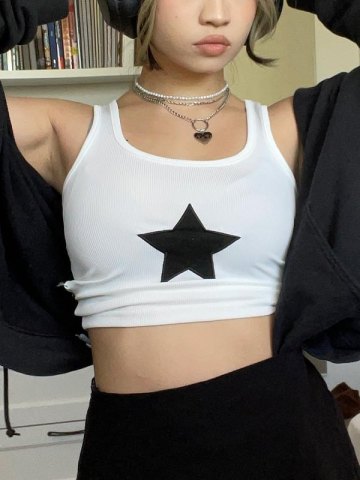 Description: Featured a star embroidered at front, these crop tops made from rib fabric, shaped to a tighten silhouette and racer back design.
