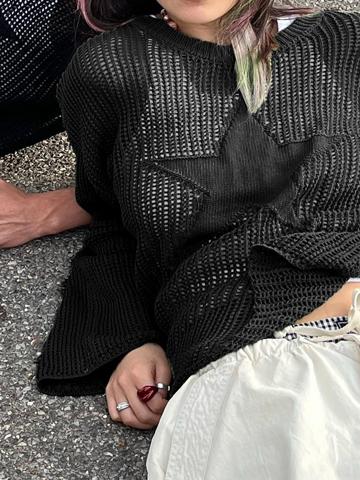 Description: Updated this trendy lightweight crochet knit layerings for fall. Shaped to a fitted silhouette, features a design of star jacquard to the front, with drop shoulders and flare cuffs detailing.