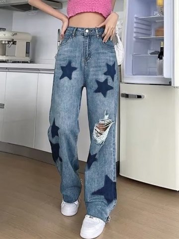 Description: With star-inspired pattern print, shaped to a relax silhouette, features frayed rip hole at front leg, a zip button fasten, frayed raw hem design, and 5 classic pockets styling.