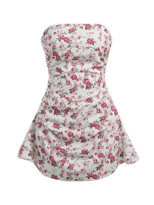 Description: This mini dress has a bandeau neck style, with floral pattern print allover the body, features ruched details, and a concealed zip fly to the back.