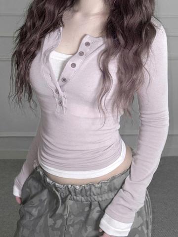 • EMMIOL V-Neck Faux Two Piece Long Sleeve