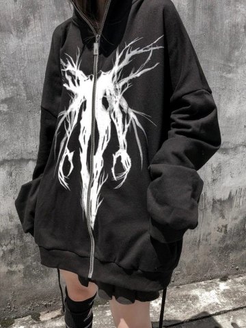 • EMMIOL Zipper Gothic Print Oversized Hoodie